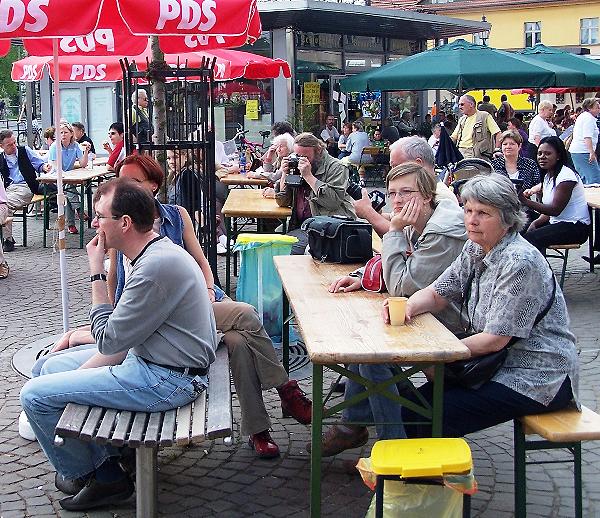 Der DGB hatte die Würde des Menschen in den Mittelpunkt seiner Mai-Kundgebungen gestellt. Petra Pau diskutierte auf der zentralen Brandenburger Mai-Kundgebung, in Potsdam, mit Gewerkschaftern und Politikerinnen. In Köpenick erläuterte sie ihre Mindestforderungen zur Änderung von Hartz IV. Und im Bötzow-Viertel warb sie gemeinsam mit dem PDS-Landesvorsitzenden Stefan Liebich u. a. für ein großes Fest am Brandenburger für Demokratie und Frieden zum 8. Mai, dem Tag der Befreiung von Faschismus und Krieg. |