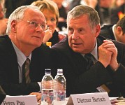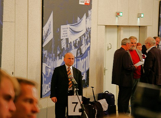 Die Delegierten der Linkspartei.PDS und der WASG tagten Wand an Wand in der Westfalen-Halle. Die jeweiligen Parteitage debattierten und beschlossen programmatische Eckpunkte, Satzungsfragen und weitere Gründungsdokumente für eine gemeinsame Linkspartei. Mit großen Mehrheiten stimmten die Delegierten der parallel beratenden Parteitage der Linkspartei.PDS (96,9 Prozent) und der WASG (87,7 Prozent) dem Verschmelzungs-Vertrag beider Parteien zu einer neuen Linkspartei zu. Dieser Beschluss muss nun durch Urabstimmungen in der Linkspartei.PDS und in der WASG bestätigt werden. |