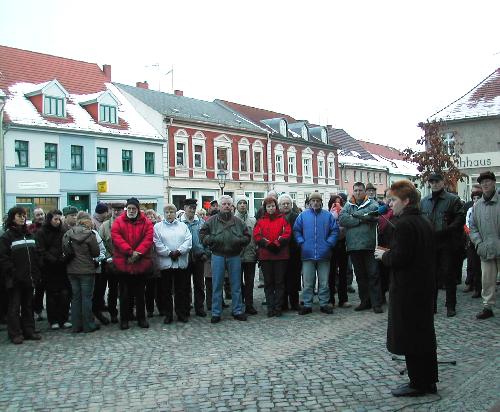 Das örtliche Bündnis gegen Hartz IV organisierte heute die bereits 27. Montagsdemonstration. Petra Pau war bereits zum zweiten Mal der Einladung gefolgt. Auf der Kundgebung vor dem Rathaus warb sie für eine Agenda sozial. Zugleich ermunterte sie die Betroffnenen, sich per Widerspruch zu wehren oder notfalls mit Hilfe des ALV gegen Hartz IV zu klagen.
