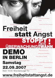Freiheit statt Angst - stoppt den Überwachungsstaat, ist eine Demonstration überschrieben, die am 22. September 2007 in Berlin stattfinden soll. Initiator ist die Initiative gegen Vorratsdatenspeicherung. Anlass ist die geplante Speicherung aller Telekommunikations-Verbindungen. Unterstützt wird der Protest von immer mehr Organisationen, auch von der Partei DIE LINKE.