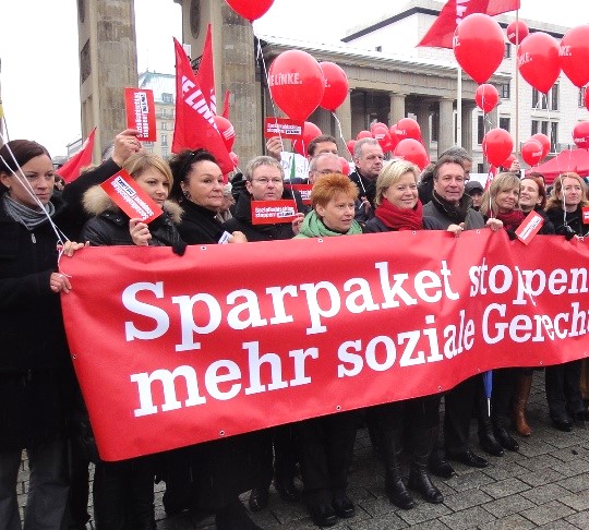 Die CDU/CSU und die FDP beschlossen heute den Haushalt für 2011 und damit auch das so genannte Sparpaket. Es sieht massive Streichungen vor allem bei Sozialbedürftigen vor. DIE LINKE lehnte dies ab. Im Umfeld des Parlamentes protestierten erneut mehrere Tausende Bürgerinnen und Bürger gegen die Regierungspolitik. Auch am Brandenburger Tor gab es eine Kundgebung.